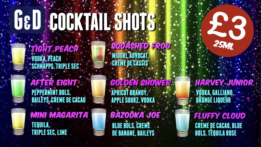 Our bar is stocked with a full range of beers and spirits, and we offer a selection of unique 25ml ‘G&D Shots’ to get you in the mood.